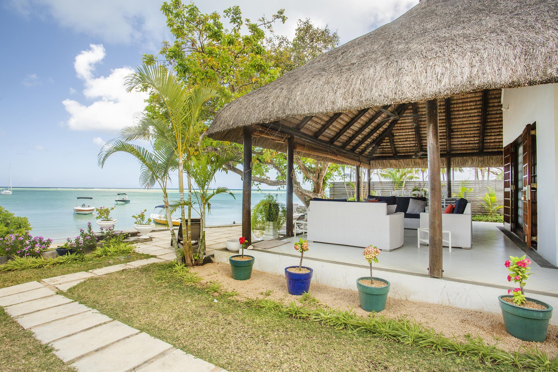Villa au style tropical, avec sa toiture en chaume et ses belles poutres apparentes, face au lagon